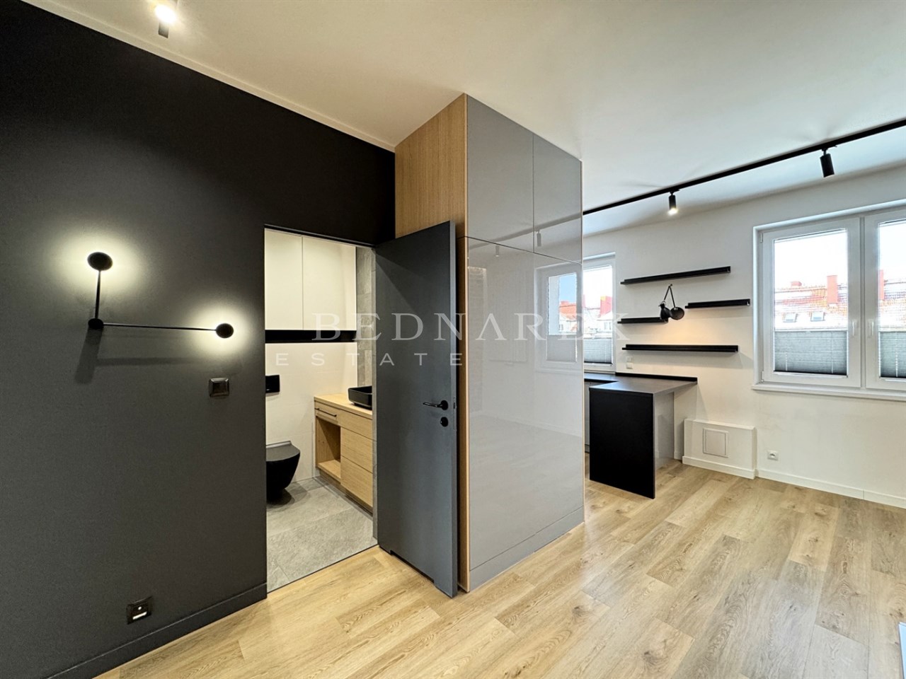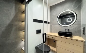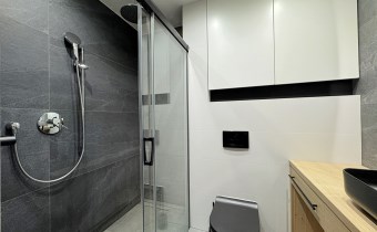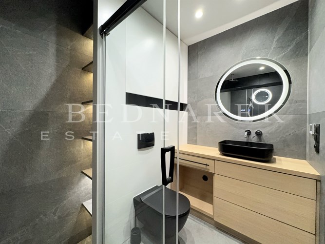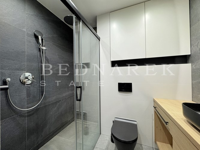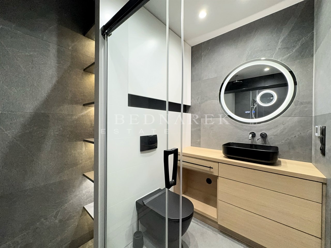 - Designerska Łazienka: Wejście do łazienki prowadzi przez nowoczesne drzwi imitujące ścianę (ukryte). W środku znajdziesz duży, komfortowy prysznic oraz perfekcyjnie doświetlone lustro – Twoja poranna rutyna stanie się przyjemnością.