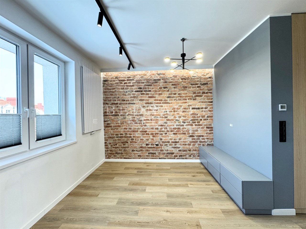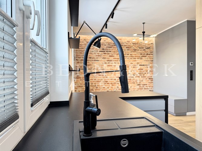 - Autentyczność: Na ścianie salonu wyeksponowano oryginalną cegłę budynku, która nadaje wnętrzu niesamowitego ciepła i loftowego charakteru.