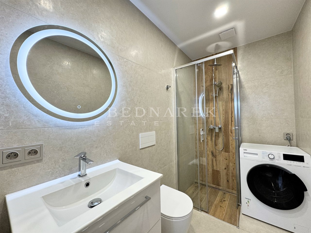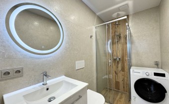 Utrzymana w nowoczesnym, minimalistycznym stylu – duży prysznic, pralko-suszarka oraz lustro z podświetleniem tworzą przestrzeń komfortu i codziennej wygody.