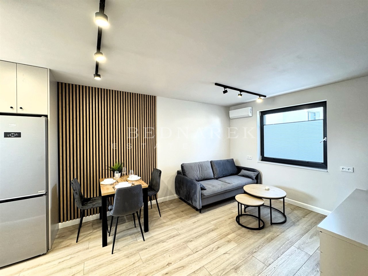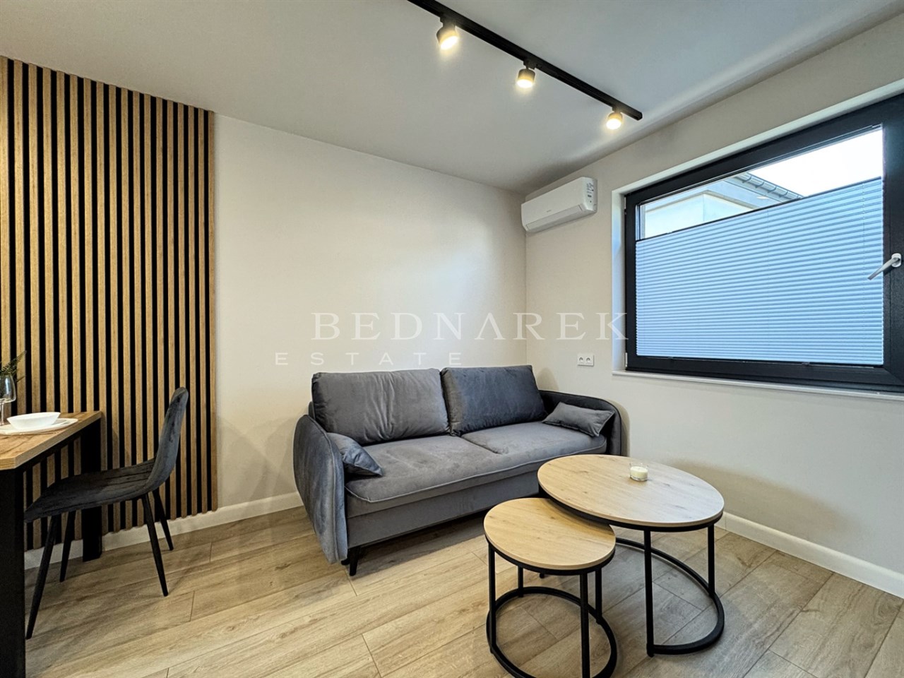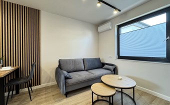 Elegancki salon z klimatyzacją, dużą, komfortową kanapą (funkcja spania), subtelnymi dodatkami i miejscem do odpoczynku, który naturalnie łączy się z aneksem kuchennym.