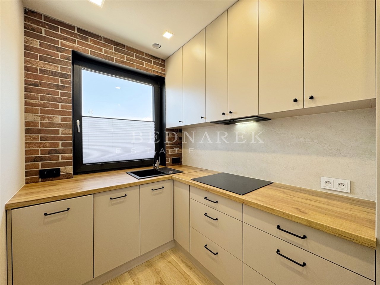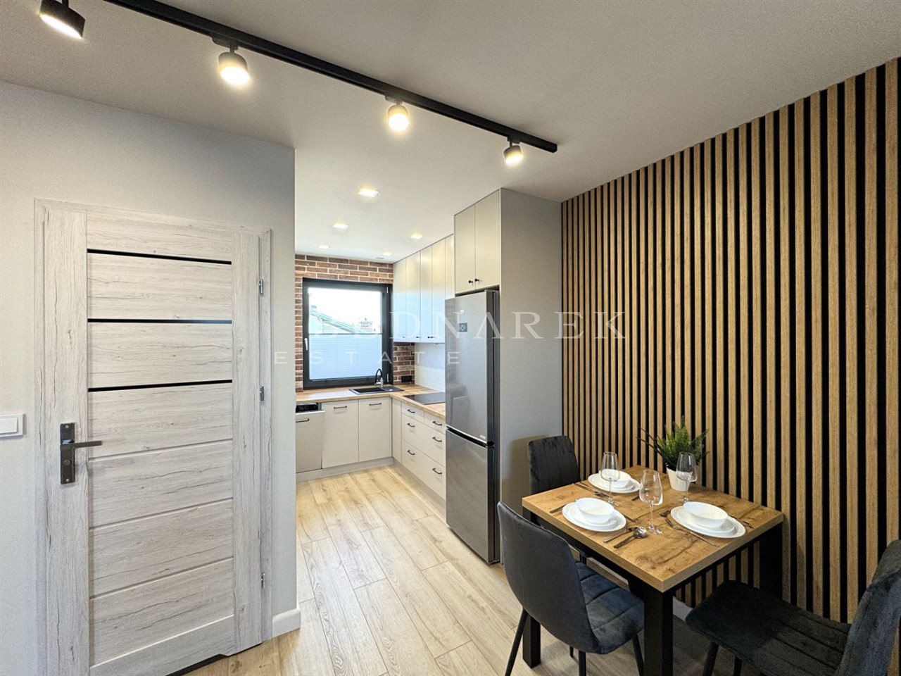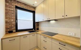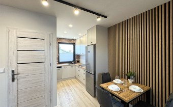 Nowoczesna i w pełni wyposażona – zmywarka, lodówko-zamrażarka, płyta elektryczna oraz liczne zabudowy, które pozwalają zachować porządek i harmonię przestrzeni.